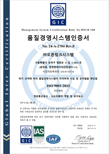 회사소개 회사개요 연혁 인증현황 고객 및 협력사 찾아오시는길 ICT사업 시스템 통합 (SI) ICT 융합 솔루션 AI 에이전트 업무자동화 AI 케어링크 AI챗봇 빅데이터 플랫폼 VDI솔루션 연구개발 AI 업무 자동화 추천 및 생성 치매진단 보조시스템 AI 정신 건강 예진 시스템 국방 연구 개발 시스템 문의하기 Contact Us 인증현황 회사소개 인증현황 회사개요 연혁 인증현황 고객 및 협력사 찾아오시는길 품질경영시스템인증서 (ISO-9001) 작성자 admin 작성일 2026-02-24 조회수 7 썸네일 품질경영시스템인증서(ISO-9001).jpg (대표) 목록 구축 문의하기 맨 위로 가기