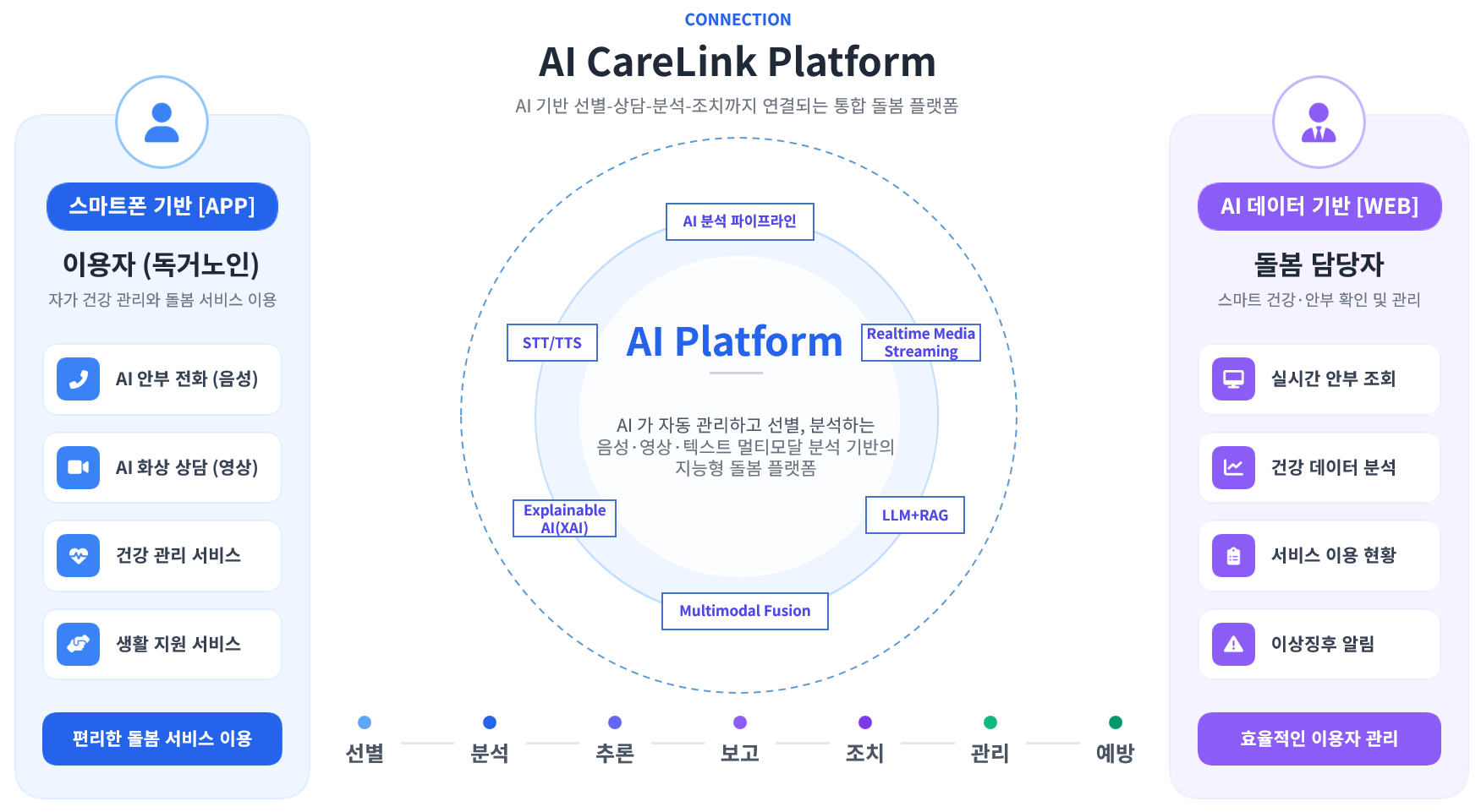 AI CareLink는 독거노인, 취약계층의 정서 상태를 자동으로 분석하고 위험 대상자를 선별하여 돌봄인력의 상담과 조치를 지원함으로써 공공 복지 서비스의 효율과 안정성을 향상
